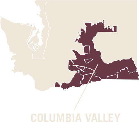 Encompassing approximately 18,000 square miles and 11 million acres in area, the Columbia Valley appellation sprawls across almost half of Washington state and contains 99% of wine grapes grown in the state. East of the Cascade Mountains, a rain shadow creates the perfect climate for wine grapes (arid desert, with less annual rainfall than Phoenix, AZ). Exceptionally long, sunny days (average of 2.5 more hours of daily sun than California in peak season) and cool nights result in great acidity, ripeness and full flavor. Dry growing conditions and sandy soils offset many pests and diseases, so vines grow on their own rootstocks; vines also enjoy dormancy for health, hardiness and consistent quality.